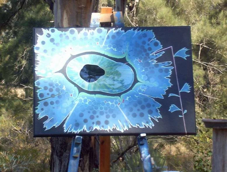 On my return, I moved to the Capertee Valley on the western edge of the Blue Mountains. Nestled amidst nature's embrace, I lived alone in an isolated rustic shack on a bush property, far from the modern world. Devoid of electricity, I relied solely on candlelight and painted during the day; the sound came from the surrounding landscape and etched itself into my subconscious, returning at night as I drifted off to sleep. Moonless nights rendered my world pitch-black, leading me to contemplate and visualise my painting in the quiet, without distractions. No lights, devices or screens were constantly draining my retinas. In the magic moments between sunset and twilight, white and coloured flowers would glow with a fluorescent vibrancy under the gradation of a blue-toned sky buzzing with ultraviolet light. The night sky, clear of light pollution, appears as a ghostly grey gradation between the stars rather than the blank perceived black. My palette shifted towards higher-frequency, blue.