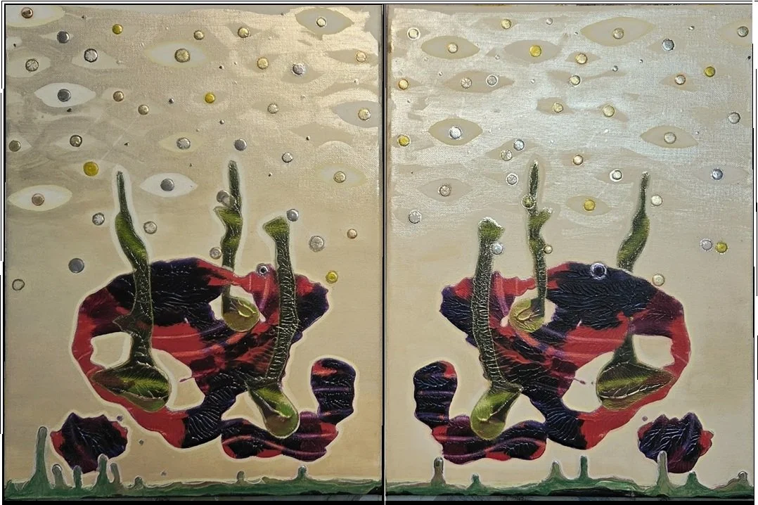Anthroposcream 2025 Finalist Northern Beaches Environmental Art Prize, 2025. MAG&M The title "Anthroposcream" merges "Anthropocene" with "Scream," referencing Edvard Munch's iconic artwork, The Scream. This diptych captures my intense emotional response to the Anthropocene—an epoch defined by human impact on the planet's future. Framed on a painted canvas mounted in a petrochemical surrounding, figures appear osseous and spectral and dissolve into a liminal space between presence and absence. Their forms have been stripped down by time, appearing calcified and juxtaposed against a backdrop of dark ecological decay. This imagery reflects environmental collapse and the silent anguish of witnessing ecocide.